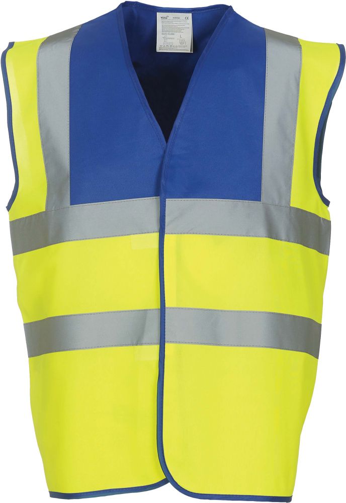Gilet haute visibilité HVW100 - Royal Blue / Hi Vis Yellow 120 grs/m² composé en 100 % polyester avec fermeture par Velcro®. Deux bandes réfléchissantes de 5 cm de large autour du corps et une sur chaque épaule. Conforme à la norme : - EN ISO20471:2013 catégorie 1. Le gilet haute visibilité HVW100 - Royal Blue / Hi Vis Yellow est vendu à l'unité mais bénéficie de tarifs dégressifs par quantité et peut être personnalisé en option. Le gilet haute visibilité HVW100 - Royal Blue / Hi Vis Yellow à l'unité