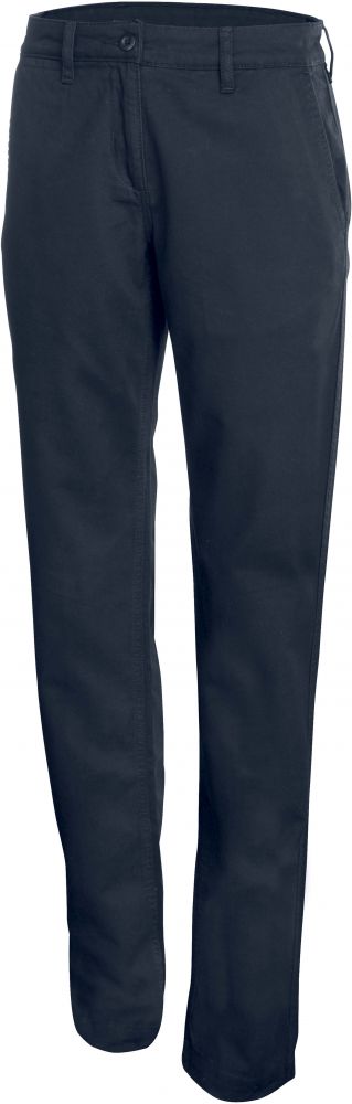 Pantalon femme chino K790 - Dark Navy composé de 100% coton sergé. Lavage aux enzymes. Coupe droite ajustée. 2 poches côtés, 1 poche ticket. 2 poches arrière passepoilées. Fermeture zippée YKK® et boutonnée. Ceinture droite avec passants. L'article Pantalon femme chino K790 - Dark Navy bénéficie de tarifs dégressifs par quantité et peut être personnalisé en option