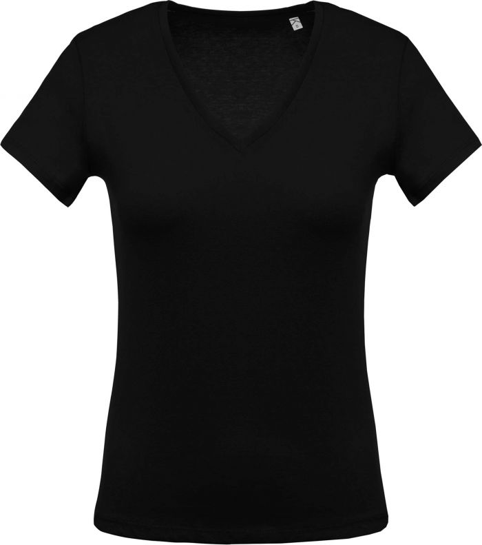 T-shirt femme col V manches courtes K390 - Black 145 grs/m² composé de 100% coton jersey, Col en bord-côte 1x1 avec élasthanne. Coupe cintrée mode. Bande de propreté ton sur ton à l'encolure. Pas d'étiquette de marque au col, uniquement une puce de taille pour faciliter la personnalisation. Le t-shirt femme col V manches courtes K390 - Black est vendu à l'unité mais bénéficie de tarifs dégressifs par quantité et peut être personnalisé en option. Le t-shirt femme col V manches courtes K390 - Black à l'unité